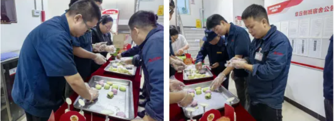 為讓重汽集團住宿職工更深度體驗節(jié)日氛圍,當(dāng)天下午,“巧手月餅DIY”活動在宿舍區(qū)歡樂開啟?;顒油ㄖ唤?jīng)發(fā)布,便吸引了眾多職工踴躍報名。傍晚六點,活動現(xiàn)場已是人頭攢動,歡聲笑語不絕于耳?,F(xiàn)場布置喜慶溫馨,操作臺上整齊擺放著由食堂提前備好的面團、豆沙、蓮蓉等多種餡料,以及各式精美的月餅?zāi)>?。在認(rèn)真了解從和面、分劑、包餡到壓模、烘烤的制作步驟后,大家迫不及待地動手實踐,現(xiàn)場氣氛熱烈,笑聲此起彼伏。忙碌一天的職工們此刻圍聚在一起,互相交流制作技巧,分享工作與生活趣事,連心物業(yè)工作人員也用鏡頭記錄下一個個溫馨快樂瞬間。經(jīng)過大家巧手制作,一個個造型精美的月餅逐漸成形,滿滿的成就感與節(jié)日的喜悅洋溢在每個人的臉上。