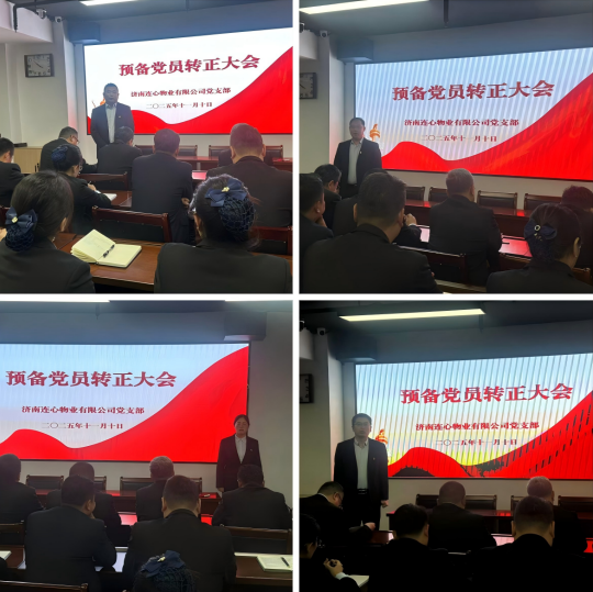 2025年11月10日下午,濟(jì)南連心物業(yè)有限公司黨支部在1701會(huì)議室召開(kāi)第四季度黨員大會(huì),公司全體黨員、入黨積極分子及遞交入黨申請(qǐng)書人員48人參加本次大會(huì)。學(xué)習(xí)黨的二十屆四中全會(huì)精神、審議預(yù)備黨員轉(zhuǎn)正事宜等兩項(xiàng)議程。