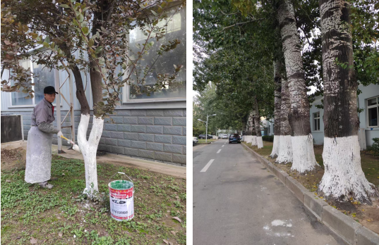 樹(shù)木是園區(qū)生態(tài)環(huán)境重要組成部分。為幫助園區(qū)內(nèi)各類(lèi)喬木、灌木安全越冬,有效防御凍害、日灼(晝夜溫差大導(dǎo)致樹(shù)皮開(kāi)裂)并消滅在樹(shù)皮縫隙中越冬的害蟲(chóng),項(xiàng)目部組織綠化養(yǎng)護(hù)人員,于十一月上旬集中開(kāi)展為期一周的“樹(shù)木涂白”專(zhuān)項(xiàng)行動(dòng)。 作業(yè)前,對(duì)養(yǎng)護(hù)人員進(jìn)行專(zhuān)項(xiàng)培訓(xùn),明確涂白劑的科學(xué)配比、涂抹高度、均勻度等標(biāo)準(zhǔn)要求。作業(yè)中,工作人員首先對(duì)樹(shù)干進(jìn)行清刮處理,去除老皮、蟲(chóng)卵,然后使用專(zhuān)用工具進(jìn)行規(guī)范涂刷,確保涂白高度整齊劃一,涂層均勻、光滑、美觀,不留死角。此次行動(dòng)共完成園區(qū)主干道、辦公樓周邊、綠地內(nèi)共計(jì)700余株樹(shù)木的涂白工作,不僅為樹(shù)木穿上了潔白的“防護(hù)服”,也成為冬日?qǐng)@區(qū)一道亮麗風(fēng)景線。