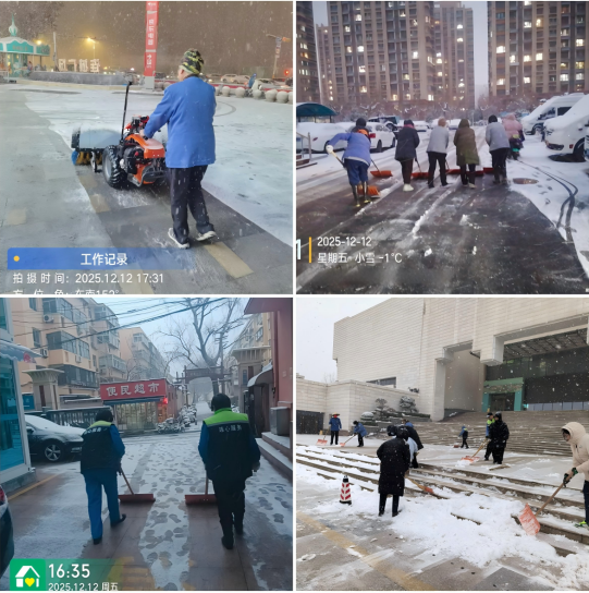 風(fēng)雪中,連心人身影堅(jiān)定。員工們不畏嚴(yán)寒,手持雪鏟、掃帚等工具,分工明確、配合有序。大家優(yōu)先對(duì)主出入口、主干道等關(guān)鍵區(qū)域進(jìn)行集中清理,快速打通通行要道;隨后將清掃范圍擴(kuò)展至廣場(chǎng)、步道、停車場(chǎng)等公共區(qū)域,全面防止積雪結(jié)冰;通過(guò)全體人員的高效協(xié)作,各園區(qū)主要通道迅速恢復(fù)暢通,最大程度降低了降雪對(duì)業(yè)主生活和工作的影響。