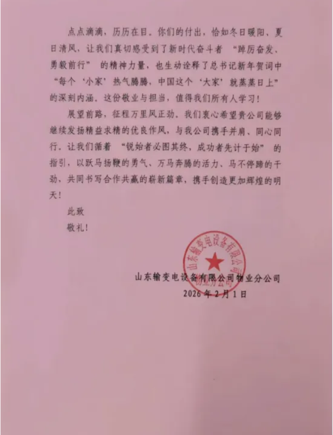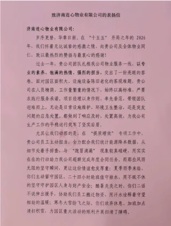 2026年2月1日,濟南連心物業(yè)有限公司收到一封來自山東輸變電設(shè)備有限公司表揚信,對連心物業(yè)過去一年的工作、服務(wù)品質(zhì)、團隊素養(yǎng)與擔(dān)當(dāng)精神給予高度評價與認可。