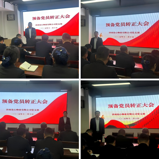 2025年11月10日下午,濟(jì)南連心物業(yè)有限公司黨支部在1701會(huì)議室召開第四季度黨員大會(huì),公司全體黨員、入黨積極分子及遞交入黨申請(qǐng)書人員48人參加本次大會(huì)。學(xué)習(xí)黨的二十屆四中全會(huì)精神、審議預(yù)備黨員轉(zhuǎn)正事宜等兩項(xiàng)議程。