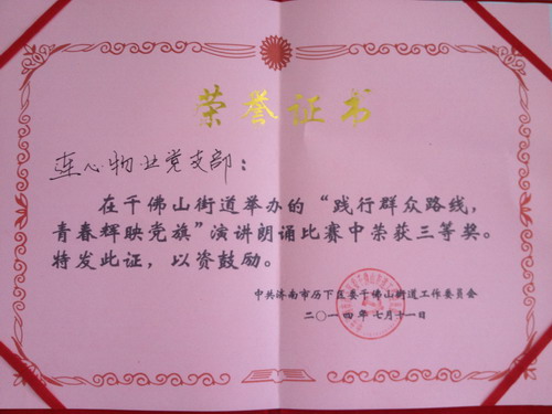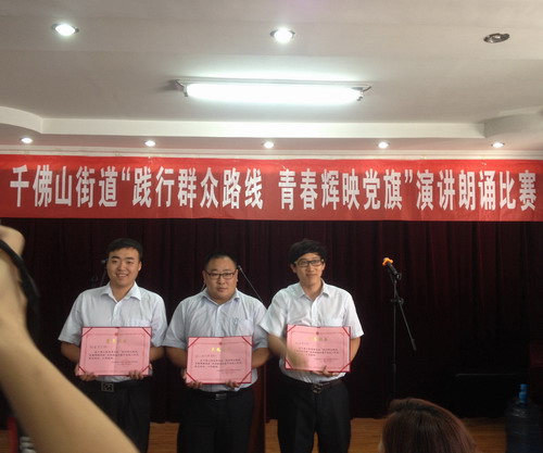 千佛山街道“踐行群眾路線(xiàn)青春輝映黨旗”演講朗誦比賽2014年7月11日上午9:00在千佛山街道會(huì )議室正式開(kāi)始,張雁翔同志代表濟南連心物業(yè)有限公司黨支部參加此次活動(dòng)。